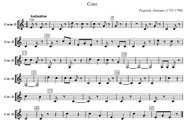 X:2102 T:Coro C:Pugnani, Gaetano (1731-1798) M:2/4 L:1/4 K:C V: 2 clef=alto name="Corno II" sname="Cor. II" %%MIDI program 1 69 %%staves [( 2 )] %------------------------------- [Q:"Andantino"] [K:treble] "^Cut" E/z/ E/z/ | CC/z/ | d/z/ c/z/ | c/z/ G/z/ | G/z/ z | Z | C/z/ G/z/ | \ CC/z/ | CC/z/ | C/z/ c/G/ | E/G/E/z/| C/ z/C/C/ | C C/z/ | d/z/ c/z/ | c/c/ G/z/ | G,/z/z | G,/z/z| \ dc | c/z/ G | G,2- | G,2- | G,2 | G,/G,/ G,/z/ | G,2- | G,2 | d c | c/c/ G/z/ | C2 | \ CC/z/ | C2- | CC/z/ | Cz | cz | cB | C/z/ C- | C/z/ C | C/z/C | C/z/C | C2 | C/z/z | \ cz | cG | EC | cG | E/G/E/z/ |] %-------------------------------