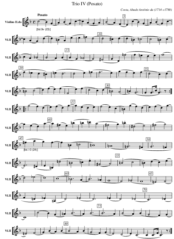 X:102 T:Trio IV (Posato) C:Costa, Abade António da (1714-c1780) M:C L:1/4 K:F V: 2 clef=treble name="Violino II.do" sname="Vl.II" %%MIDI program 1 40 %%staves [ 2 ] %----- edit between the lines ---- [Q:"Posato"] "_[fol.9v (23)]" (c2B)(G | A)(BG)c- | c (AGA) | (B2A)(F | E) (cB)(G | A)(B G) c- | c (AG)(d | d) (=BA)(e | e =f) (d2 | d2 ^c)(d | d=B)(=c2 | c2=B)(c | cA)(_B2 | B2A)(B | BG)(_A2 | G2) (^F2 | GD)(=f2 | f=ede) | (f4 | f_ed^c) | (=ed3 | d2e) (=f | f3e) | (gfe)(f | d2c)(d | =B2) (c2 | d)(fe)(f | F2e) (f | d2c)(d | =B2)(A2 | =B)(G3 | G G/>c/ G)>z :|: (g2f) (d | e)(fd)g- | g(ede) | (f2e)(c | =B)(gf)(d | e)(fd)g- | g (ed)a- | a(^fe)(=b | =b=c')(a2 | ^f2g).=b | (^d2e2) | (^f2g2) | "_[fol.10 (24)]" (^fag)f- | f(=B=c2 | =B4) | (=A4 | =G3)(^F | G3=F | E3)(^D | E=B,) (=d2 | =B2=c).e | (^G2A2) | (=B2c2 | =B)(dc)(e | d2)(_e2 | d4) | (c4 | _B3)(A | B3)(_A | G4 | F2)(_G2 | F4 | =E2)(F2 | F=D_E)(=A, | D2)(_E2 | D3)(_E | D2)(_D2 | C3)(_D | C4) | (c2B)(G | =A)(B3 | A)(B3 | B3A) | (B2A)(B | G2 F)(G | =E2)(F2 | G)(BA)(B | B2A)(B | G2F)(G | E2)(D2 | E)(C3 | C C/>F/ C)>z :|] %---------------------------------