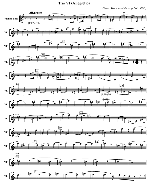 X:801 T:Trio VI (Allegretto) C:Costa, Abade António da (1714-c1780) M:C L:1/4 K:C V: 1 clef=treble name="Violino I.mo" sname="Vl.I" %%MIDI program 1 40 %%staves [ 1 ] %----- edit between the lines [Q:"Allegretto"] "_[fol.7v (19)]" z | z2 z (a/>g/ | f2 A) (c/>B/ | c/>e/ e d) (=g/<=f/ | e) .^G2 (e | e d E) (e | e d E) (e | e d3 | d ^c e) (a | a2 ^g) (=f | e) .b2 (e | e2 ^d) (=c | B ^d e) (g | ^f2) B2- | B (b ^g) (e | e ^d e) (g | ^f3) (=f | e3) (^f | ^d) (e3 | e ^d ^f) (=c' | b2 a) (=c' | b2 a) (=c' | b2 a > ^f) | (a/g/^f/e/) z :|: z | z2 z (e/>d/ | =c2 E) (G/>^F/ | B2 A) (=d/<=c/ | B) .^D2 (B | B A B,) (B |B A B,) (B | B A2 ^G) | (B A2) .^G | (B A2) .^G | (B A2) (_B | "_[fol.8 (20]" _B A2) (=G | G ^F) z .^f | (g d2) .^f | (g d d) (^f | a) (g3 | g ^f) (=f2 | f =e) (_e2 | d3) (=f | =e) (c2 =B | B d) .G (b | b a2) (g | g =f2) (e | e d2) (c | B) (^D E) (=G | ^F) (A ^G) .e | .A (e2 =d | d) .^G (B2 | A) (^G A) (c | B) (d ^c) .a | .d (a2 =g | g) ..^c (e2 | d) (^c d) (f | e) .g2 (e | f) (e f) (=b | ^g) .e2 (=c | B) (^f e ^d | ^d) (e =d ^c | ^c) (d2 ^c | ^c) (d =c2 | B4) | .d3 (=f | e2 d) (=f | e2 d) (=f | e2 d> B) | d/c/B/A/ z :|] %---------------------------------