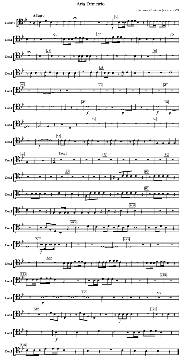 X:1101 T:Aria Demetrio C:Pugnani, Gaetano (1731-1798) M:C L:1/4 K:Bb V: 1 clef=alto name="Corno I" sname="Cor.I" %%MIDI program 1 69 %%staves [( 1 )] %------------- write between the lines ------------- [Q: "Allegro"] [M:C] [K:alto4] z// | B,DB,z| CC!fermata!Cz| z4 | z2z!f!F, | B,/B,/4B,/4 D/D/4D/4 B,z| C/C/4C/4 C/C/4C/4 Cz | B,zz2| \ !fermata!z4 | B,/B,//B,// D/D//D// B,z| C/C/4C/4 E/E/4E/4 C z | B, B, B, z | !fermata!z4 | !fermata!z4 | B,4 | B, z z2 | z/2> B,/2B,/2>B,/2 B, z | z4 | B,2 C2 | B, z z2 | z4 | z4 | z/2 B,/2 B, z/2 C/2 C | B, z B, B, | D2 C C | B,/2B,/2 B, z/2 C/2 C | B,4 | z4 | z4 | C4 | z4 | F,4- | F, z z2 | z4 | z4 | z4 | z4 | z4 | z4 | z4 | z4 | z4 | z4 | C4 | F, z F,2 | !f!C4 | F, z z2 | !p!F,4- | F, z F,2 | !f!C4 | !p!F,4- | F,4 | F,2 F, z | z2 D, z | z4 | z4 | z4 | z4 | z4 | z4 | z4 | z4 | z4 | !f!C4- | C4 | C/2C/2 C z2 | z/2 C/2 C z2 | z/2 C/2 C z2 | z/2 C/2 C z C | F, F, F, F, | F, z z2 || [M: 3/4] [Q: "Tacet"] z3 | z3 | z3 | z3 | z3 | z3 | z3 | z3 | z3 | z3 | z3 | z3 | z3 | z3 | z3 | z3 | z3 | z3 ||[M: C] F,/2C/2C/2C/2 C z | z/2 C/2C/2C/2 C z | z/2 B,/2B,/2B,/2 B, z | C z B, z | F,/2C/2C/2C/2 C z | z/2 C/2C/2C/2 C z | z/2 B,/2B,/2B,/2 B, z | C z B, z | F, F,/2>F,/2 F, F, | F, F, F, z | B, z B, z | B, z z2 | z4 | z4 | z4 | z/2 B,/2F,/2D,/2 B,, z | B,2> D2 | C B,/2D/2 B,/2D/2B,/2D/2 | B,4 | B, B,/2D/2 B, z | !fp!F,4 | !f!B,/2>B,/2B,/2>B,/2 B, z | z4 | z4 | F,4- | F,4 | F,4 | B, z z2 | z4 | z4 | z4 | z4 | B,/2B,/4B,/4 D/2D/4D/4 B, z | C/2C/4C/4 E/2E/4E/4 C z | z4 | B,/2B,/4B,/4 D/2D/4D/4 B, z | C/2C/4C/4 E/2E/4E/4 C z | z4 | B,/2B,/4B,/4 D/2D/4D/4 B, z | z4 | z4 | z4 | z4 | !p!B,4- | B,4- | B,4 - | B,4 | B,2 B, z | B, z z2 | !fermata!z2 z2 | z4 | z2 z/2 D/2B,/2F,/2 | D, z z/2 D/2B,/2F,/2 | D, z z2 | z/2 !f!B,/2B,/2B,/2 B, z | z4 | B, z B, z | D2 C2 | !f!B, z B, z | D2 C2 | B,/2B,/4B,/4 D/2D/4D/4 B, z | C/2C/4C/4 E/2E/4E/4 C z | B, z D C | B, B, B, z |] \ %---------------------------------------------------