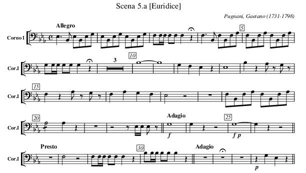 X:1901 T:Scena 5.a [Euridice] C:Pugnani, Gaetano (1731-1798) M:C L:1/4 K:Eb V: 1 clef=alto name="Corno I" sname="Cor.I" %%MIDI program 1 69 %%staves [( 1 )] %--- edit between the lines ---------- [K:bass][Q:"Allegro"] E,>B,, E,/B,,/E,/G,/ | E,/B,,/E,/G,/ E,/B,,/E,/G,/ | F,/F,//F,// F,/F,/F,!fermata!z | \ F,>B,, F,/B,,/F,/A,/ | F,/B,,/F,/A,/ F,/B,,/F,/A,/ | G,/G,//G,// G,/G,/G, !fermata!z | Z3 | \ B,4- | B,4 | G,F,E,z | E,4 | B, zA,/z/ G,/z/ | F, z A,/z/ G,/z/ | F,A,G,F, | E,2z2 | Z | \ F,/B,,/F,/A,/ F,/B,,/F,/A,/ | !/!A,2 A, z | Z | z2 z/ E,//E,// E,/z/ || \ [Q:"Adagio"] !f! G,4 | G, zz2 | !f!!p! G,4 - | G, zz2 || \ [Q:"Presto"] Z | F,2 z2 | F,/F,//F,// F,/F,/F, z | B,/B,//B,// B,/B,/ B, z || \ [Q:"Adagio"] Z | !fermata!Z | Z | !p! z G, E, z || %---------------------------------------------
