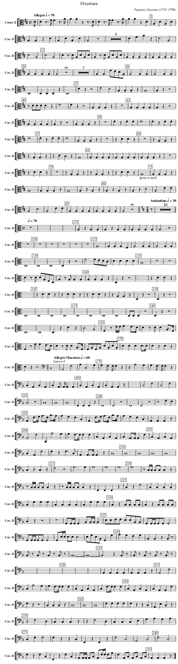 X:102 T:Overtura C:Pugnani, Gaetano (1731-1798) M:C L:1/4 K:D V: 2 clef=alto name="Corno II" sname="Cor. II" %%MIDI program 1 69 %%staves [( 2 )] %-------------------------------------- [Q: "Allegro" 1/2=70] D// |D z/>F/ F z/>A/| A A z z/>D/ | D z/>F/ F z/>A/| A A z D | A, D A, D | \ A, A, z D | A, D A, D | A,2 z2 | Z3 | DFAz | D2A,2 | \ D2A,2 | D2A,2 | D z/D/ A,/D/A,/D/ | A, z/D/ A,/D/A,/D/ | \ A,A,A,A, | A,A,A,A, | A,A,A,A, | A,2 !fermata! z2 | \ Z7 | A,A, F/E/D/A,/ | A,2 A,A, | A,2 A,A, | \ D,4 | D, D, D, z | D,4 | D z z2 | \ E2 D2 | A, A, A, z | A,4 | A, z z2 | \ z/D/D/D/ D z | E4 | E z z2 | A, A, A, z | \ z4 | A, A, A, A, | A, z z2 | A, A, A, A, | \ A, z z2 | A, A, A, z | z4 | E z E E | \ E4 | E z E E | E4 | E z E E | \ E4 | A, A, A, z | z4 | z D D z | \ z4 | z A, A, z | z A, A, z | z D C z | \ A,4 | A, A, A, A, | A, A, A, A, | A, A, A, z | \ z4 | z D D z | z4 | z A, A, z | \ z A, A, z | z D D z | "_[error in ms?]" A,4 | A, A, A, z | \ A,4 | A, A, A, z | A,4 | A, z A, z | A, z A, z | A, z D2 | A,2 E E | A,2 D2 | \ A,2 E E | A, A, A, A, | A, A, A, A, | A,2 !fermata!z2 || [M:2/4] [K:C] [L:1/8] [Q: "Andantino" 1/2=30] z | Z23|| [M:C] [L:1/4] [Q:1/2=70] z4 | x4 | x4 | x4 | \ A, z A, A,| A,z A, A, | A, A, A, A, | A,2 z2 |z4 | \ z4 |z4 |z4 |z4 | \ z4 |A,4 |A, A, A, F, |A,2 A, A,|A,2 A, A,|D,4 | \ D,4 |D,4 |D, z z2 |F2 F/E/D/C/ | \ D D D D |A,4 | z4 |z4| D z/D/ D/A,/F,/D,/ | \ A, z/A,/ A, A, | A, A, A, z | D, z z2 | x4 | \ z D D z | x4 | z D D z | z D D z | \ z D D z | z A, A, z | D, z z2 | D, z z2 | \ D,4 | D,4 |D,4 |D,4 | \ D,4 |D,4 |D,4 | D,4 | \ D,/D,/ D, z2 | D, z z2 | D,4 |D,4 | \ D, z D z | C2 A,2 | F, z/E//E// F E/>D/ | D z/D/ D A,/>F,/ | \ F, z/F/ F E/>D/ | D z/D/ D A,/>F,/ | F,/A,/F,/A,/ D/A,/D/A,/| D D D D/>D/ | D z D z | \ D z z2 || [K: F bass] [L:1/4] [Q: "Allegro Maestoso" 1/2=60] "Corni in F" x3/8 | A,,2 F,2 |A, C,2 G, | G, F,/> F,/ F, z | \ z A,2 G,| G, F,/> F,/ F, z | C, A,, C, A,, | C, A,,/> A,,/ A,, A,, | C, A,, C, A,, | \ C, A,, A,, z | x4 | C,2 F,2 | C,2 F,2 | \ C,2 z2 | C,4 |C,4 |C,4 | \ F,, F,, F,, z | F,,4 | F,,2 z2 | F,,4 | \ F,,2 z2 | z2 F, E, | A,, F,/>G,/ A,/>F,/ B,/>A,/ | A, G, F, C, | \ A,, F,/>G,/ A,/>F,/ B,/>A,/ | A, G, F, C, | A,, A,, A,, z |A,,2 F,2 | \ C,, A,2 G, | G, F,/>F,/ F, F, | C, A,, C, A,, | C, A,,/>A,,/ A,, F, | \ C, A,, C, A,, | C, A,, F,2 |F, z F,> C,| A,, A,,/>A,,/ A,, z | C,4 | \ C,4 |C,4 |C,4 |C,4 | \ C, z C, z | F,2 z2 | G,2>G,2 | G,4 | \ G,4 |G,4 |G,4 | z/ C,//C,// C,/C,/ C, z | \ z/ C,//C,// C,/C,/ C, z | z/ C,//C,// C,/C,/ C, z | F,, F,, F,, z | C, z G,2 | \ C, C, C, C, | C, G, G, G, | C, C, C, C, | C, G, G, G, | \ C, z C,/C,/ C,/C,/ | C, z C,/C,/ C,/C,/ | C, z z2 | Z | \ G,,/G,,//G,,// G,, B,,/B,,//B,,// B,, | E,/E,/F,/F,/ E,/E,/B,,/B,,/ | G,,/G,,//G,,//G,,/G,,/ G,,2| \ G,,/G,,//G,,//G,,/G,,/ G,,2| G,,/E,//E,// E,/E,/ E,2 | E,/G,/E,/B,,/ G,, G, | \ A, G, F, G, | B,, B,, z B,,/ z/ | B,,/z/ B,,/z/ B,,/z/ B,,/z/ | B,,4- | \ B,,4- |B,,2 z B,,/ z/ | B,,/z/ B,,/z/ B,,/z/ B,,/z/| x4 | x4| x4| x4| x4 | x4 | \ A,, A,, A,, A,, | A,, A,, A,, z | A,,2 F,2 | \ C, A,2 G, | G, F,/>F,/ F, F, | C,A,,C,A,,|C,F,/>F,/F,F,| \ C, A,, C, A,, | C, A,, A,, F, | F, z z2 | C, C, C, z | \ C,4 |C,4 |C,4 | F, F, F, F, | \ F, z z C, | A,, E, C, z | z F,2 D, | C, C, C, z | \ z F,2 D, | C, C, C, E, | G, A, G, A, |C, F, F,2 | \ F, z z C, | F,, z F,, z | F,2 C,2 | A,,2 C,2 | \ F,2 C,2 | F, z F, C, | F,, z F, C, | A,,/A,,//A,,// A,,/C,/ A,,/F,//F,// F,/A,/ | \ F, A,,/C,/ A,,/C,/ A,,/C,/ | A,, A,, A,, z |] %--------------------------------------