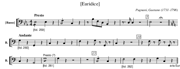 X:2414 T:[Euridice] C:Pugnani, Gaetano (1731-1798) M:4/4 L:1/4 K:Eb V: 14 clef=bass name="[Basso]" sname="B." %%MIDI program 1 42 %%staves [ 14 ] %----------------------- "_[fol. 259]" [Q:"Presto"] !/!E,2E,z | !/!C,2C,z | z/B,/F,/D,/B,, z | z/>D,/D,z2 | E,2 !fermata! z2 ||\ "_[fol. 260]" [Q:"Andante"] [K:C] G,zG,,z | C,zC,z | F,z G,/z/ G,,/z/ | C,zz2 | z F,/z/ G,/z/ G,,/z/ | C,z A,,2 | "_[fol. 261]" "^Presto (?)" !/! G,4 | G, zz2 | Z | !/! C,2C,z | \ "_[fol. 262]" F,2F,z | zG,C, "_aria Euridice" z || %-----------------------