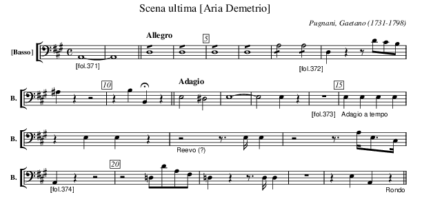 X:3714 T:Scena ultima [Aria Demetrio] C:Pugnani, Gaetano (1731-1798) M:C L:1/4 K:A V: 14 clef=bass name="[Basso]" sname="B." %%MIDI program 1 42 %%staves [ 14 ] %--------------- "_[fol.371]" A,,4- | A,,4 || [Q:"Allegro"] !/! D,4 | !/! D,4 | !/! D,4 | !/! D,4 | !/! A,2 \ "_[fol.372]" !/! A,2 | D, z z/D/C/B,/ | ^A,zz2 | z B,!fermata! B,, z || [Q:"Adagio"] E,2 ^D,2 | E,4- | E,2 E, z | \ "_[fol.373]" Z | "_Adagio a tempo" E,E,E,E, | zE,E,z | "_Reevo (?)" z2 z/ > E,/E, | z2 z/>A,/E,/>C,/ | \ "_[fol.374]" A,,z z2 | z2 =D,/D/A,/F,/ | =D, z z/ > D,/ D, | Z | z E,A,, "_Rondo" z || %---------------