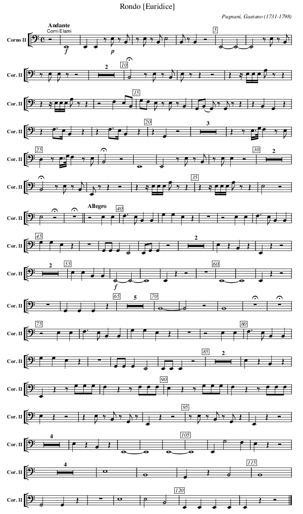 X:3802 T:Rondo [Euridice] C:Pugnani, Gaetano (1731-1798) M:C L:1/4 K:E V: 2 clef=alto name="Corno II" sname="Cor. II" %%MIDI program 1 69 %%staves [( 2 )] %------------------- "^Corni Elami" [Q:"Andante"] [K:bass] [K:C] z2 | !f! E,,4 | E,,E,, z/ !p! E,/ z/B,,/ | \ z/E,/ z/ B,,/ E,2 | B,,/z/ B,, z2 | E,,2-E,,2-| E,,2 z/E,/ z/B,,/ | z/E,/ E,/z/ z2 | Z2 | \ !fermata! B,,2 z/E,/ z/B,,/ | E,/z/ z z2 | z z//E,//E,//E,// A,/z/ z | z z//E,//E,//E,// A,/z/ z | \ z2 F, E,/B,,/ | G,/F,/ E,/ z/ E,/z/ B,, | G,,/(B,,/ G,,/)z/ G,,/z/ z | zB,,G,, z | \ zF,3/4E,//B,,z | zF,3/4E,//B,,z | zG,,z2 | Z3 | zz/E,3/8G,1/8F,z/E,/ | D,z/E,3/8G,1/8F,z/E,/| \ !fermata! B,,2 z2 | E,,4 | E,,2 z/E,/ z/B,,/ | z/E,/ E,z2 | Z2 | !fermata! B,,2 z/E,/ z/B,,/ | E,,/ z/z z2 | zz//E,//E,//E,// A,/z/z | \ zz//E,//E,//E,// A,/z/z | E,2z2 | E,2 !fermata! z2 | !fermata! Z || \ [Q:"Allegro"] z2 E,1E,1 | F,3/2E,/B,,B,, | G,1G,1E,z | Z | z2 E,1E,1 | F,3/2E,/B,,B,, | G,1G,1E,z | Z | \ G,,/G,,/ G,,E,,2 | E,,/G,,/ G,, z2 | Z2 | E, z B,, z | E,, z z2 | Z2 | \ E,E, B,, B,, | !f! E,,2- E,,2- | E,,4 | E,,zz2 | Z | E,,4- | E,,4 | E,,z z2 | Z | G,,G,,G,,z | Z5 | B,,4- | B,,2 z2 | B,,4 | \ !fermata! Z | !fermata! Z | z2 E,1E,1 | F,3/2E,/B,,B,, | G,1G,1E,z | Z | z2 E,1E,1 | F,3/2E,/B,,B,, | G,1G,1E,z | Z | \ G,,/G,,/ G,,E,,2 | E,,/E,,/ E,, z2 | Z2 | E, z B,, z | E,, z z/G,/G,/G,/ | F,zz/F,/F,/F,/ | E,zz/G,/G,/G,/ | F,zz/F,/F,/F,/ | E,zz2 | zE,/ z/B,,/ z/G,,/z/ | E,,zz2 | z/E,/ z/B,,/ z/G,,/z | E,,zz2 | Z4 | \ E,zB,,z | E,,4- | E,,4 | E,,4- | E,,4 | E,,G,2 F, | E,zz2 | Z4 | E,4 | B,,4 | G,,z B,,2 | B,,4 | \ G,,2G,,z | Z | E,4 |E,2B,,2 | E,,E,,E,,E,, | E,, zz2 |] %-------------------