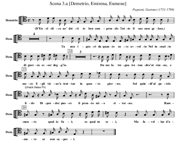 X:719 T:Scena 3.a [Demetrio, Emirena, Eumene] C:Pugnani, Gaetano (1731-1798) M:C L:1/4 K:C V: 19 clef=tenor name="Demetrio" sname="Dem." %%MIDI program 1 1 %%staves [[ 19 ]] %------------------------------------------------------------------- [L:1/8] z B,/ D/ D A,/ A,/ F, F, F, F,/ G,/ | A,/ A,/ A,/ A,/ B, C/ D/ B, B, z2 | Z4 | \ w: (D'Eu-ri-di-ce ne' det-ti io ben com-pren-do Tut-to il suo cuor ge-loso.) z4 C2 B, A, | ^G,/ G,/ E,/ E,/ E, E,/ ^F,/ ^G,/ G,/ G,/ G,/ G, G,/ A,/ | B, B, B, ^C/ D/ ^C C z2 | Z3 | z6 \ w: Tu non i-gno-ri da quan-te cu-re av-vol-to Nel tu-mul-to di guer-ra es-ser deg-g'io. z/A,/ A,/ D/ | D A, z/ A,/ C/ D/ B, B, z D| D/ G,/ G,/ G,/ G, G,/ A,/ B, D D _E | C C z \ w: Da me la tre-gua An-tan-dro'ot-ten-ne, e me-co E-gli vie-ne'a trat-tar in ques-to gior-no. C C C A, G, | "(check these Fb)" _F, F, z/ A,/ A,/ _B,/ G, G, z/ A,/ C/ A,/ ^F, F, z G, | G, D, z6 | \ w: Sol quin-di'al pa-trio li-do Di-pen-der puo-re il pron-to mi-o ri-tor-no. z6 zB, | ^G, G, z ^G,/ A,/ B, B, z/ B,/ D/ E/ | ^C C z2 \ w: Ram-men-to qual io fu-i; so qual tu se-i, G, G, G, G,/ A,/ | ^F, F, F, ^G,/ A,/ A, E, z2 | Z |] w: Ma fa-vel-lar d'a-mo-re or non sa-pre-i. %-------------------------------------------------------------------