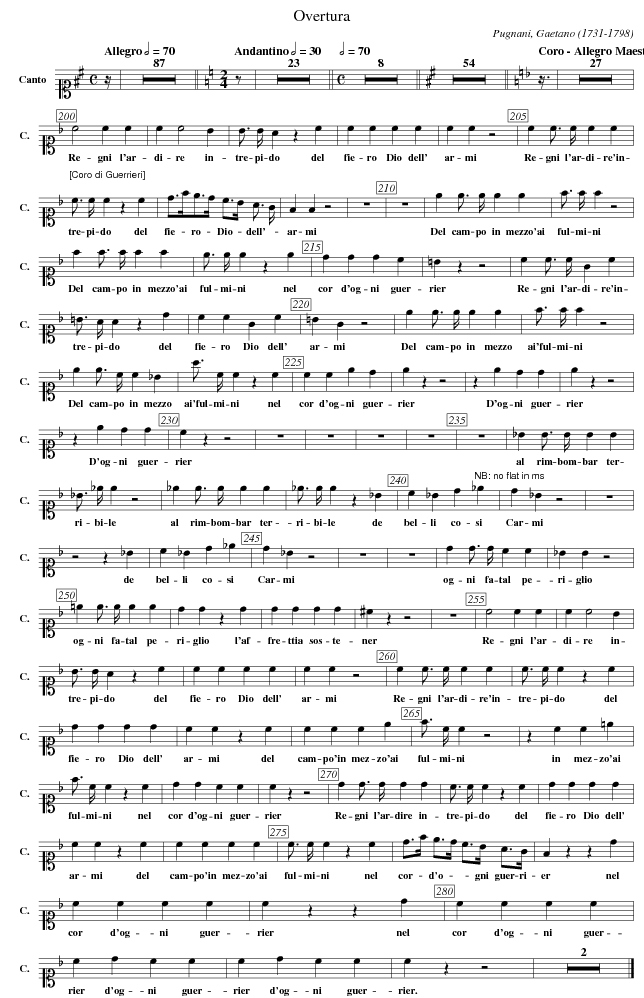 X:115 T:Overtura C:Pugnani, Gaetano (1731-1798) M:C L:1/4 K:D V: 15 clef=alto1 name="Canto" sname="C." %%MIDI program 1 1 %%staves [[ 15 ]] %----------------------------------------------------------------------------------- [Q: "Allegro" 1/2=70] z// | Z87 || \ [M:2/4] [K:C] [L:1/8] [Q: "Andantino" 1/2=30] z | Z23 || \ [Q: 1/2=70] [M:C] Z8 || \ [K: D] Z54 || [K:F] [L:1/4] [Q: "Coro - Allegro Maestoso" 1/2=60] z3/8 | Z27 | \ "_[Coro di Guerrieri]" c2 c c | c c2 B | B3/4 B1/4 A z c | c c c c | c c z2 | \ w: Re-gni l'ar-di-re in-tre-pi-do del fie-ro Dio dell' ar-mi c c3/4 c1/4 c c | c3/4 c1/4 c z c | d3/4f1/4e3/4d1/4 c3/4B1/4 A3/4 G1/4 | F F z2 | z4 | \ w: Re-gni l'ar-di-re'in-tre-pi-do del fie--ro-- Dio-- dell'-- ar-mi z4 | e e3/4 e1/4 e e | f3/4 f1/4 f z2 | f f3/4 f1/4 f f | e3/4 e1/4 e z \ w: Del cam-po in mezzo'ai ful-mi-ni Del cam-po in mezzo'ai ful-mi-ni e | d d d c | =B z z2 | c c3/4 c1/4 G c | =B3/4 A1/4 A z d | c c G c | =B G z2 | \ w: nel cor d'og-ni guer-rier Re-gni l'ar-di-re'in-tre-pi-do del fie-ro Dio dell' ar-mi e e3/4 e1/4 e e | f3/4 f1/4 f z2 | e e3/4 c1/4 c _B | a3/4 c1/4 c z c | c c e d | \ w: Del cam-po in mezzo ai'ful-mi-ni Del cam-po in mezzo ai'ful-mi-ni nel cor d'og-ni guer- e z z2 | z e d d | e z z2 | z e d d | c z z2 | z4 | \ w: rier D'og-ni guer-rier D'og-ni guer-rier z4 | z4 | z4 | z4 | _B B3/4 B1/4 B B | _B/> _e/ e z2 | \ w: al rim-bom-bar ter-ri-bi-le _e e3/4 e1/4 e e | _e3/4 e1/4 e z _B | c _B d "^NB: no flat in ms"_e | d _B z2 | z4 | \ w: al rim-bom-bar ter-ri-bi-le de bel-li co-si Car-mi z2 z _B | c _B d _e | d _B z2 | z4 | z4 | \ w: de bel-li co-si Car-mi d d/> d/ c c | _B B z2 | =e e/> e/ e e | d d z d | d d d d | ^c z z2 | z4 | \ w: og-ni fa-tal pe-ri-glio og-ni fa-tal pe-ri-glio l'af-fre-ttia sos-te-ner c2 c c | c c2 B | B3/4 B1/4 A z c | c c c c | c c z2 | \ w: Re-gni l'ar-di-re in-tre-pi-do del fie-ro Dio dell' ar-mi c c/ > c/ c c | c/ > c/ c z c | d d d d | c c z \ w: Re-gni l'ar-di-re'in-tre-pi-do del fie-ro Dio dell' ar-mi c | c c c e | f/ > c/ c z2 | z c c =e | f/ > c/ c z c | d d c c | c z z2 | \ w: del cam-po'in mez-zo'ai ful-mi-ni in mez-zo'ai ful-mi-ni nel cor d'og-ni guer-rier d d/ > d/ d d | c/ > c/ c z c | d d d d | c c z c | c c c c | c/ > c/ c z \ w: Re-gni l'ar-dire in-tre-pi-do del fie-ro Dio dell' ar-mi del cam-po'in mez-zo'ai ful-mi-ni c | d/>f/ e/>d/ c/>B/ A/>G/ | F z z d | c c c c | c z z \ w: nel cor-- d'o---gni guer-ri-er nel cor d'og-ni guer-rier d | c c c c | c d c c | c d c c | c z z2 | Z2 |] \ w: nel cor d'og-ni guer-rier d'og-ni guer-rier d'og-ni guer-rier. %-----------------------------------------------------------------------------------