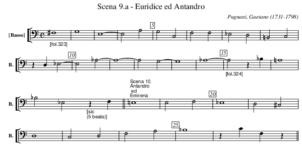 X:3014 T:Scena 9.a - Euridice ed Antandro C:Pugnani, Gaetano (1731-1798) M:C L:1/4 K:C V: 14 clef=bass name="[Basso]" sname="B." %%MIDI program 1 42 %%staves [ 14 ] %------------------ "_[fol.323]" ^F,4 | G,4 | E,4- | E,2 A,2 | G,2 C,2 | F,2 F,2 | _E,2 D,2 | =B,,2 C,2 | z D, _E,2- | E,2 _A,2 - | A,4 - | A,2 G,2 - | G,4 | _A,4 - | \ "_[fol.324]" A,2 z _B, | =A,4 | _B,2 _E,2 "_[sic ;(5 beats)]" z F, || "^Scena 10.;Antandro;ed;Emirena" =E,4 | E,2 F,2 |`_E,4 | D,2 ^C,2 | D,4 | C,2 D,2 | F,2 A,2 | _B,4 | z CF, z || %------------------
