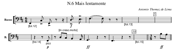 X:405 T:N.6 Mais lentamente C:Antonio Thomaz de Lima M:6/8 L:1/4 K:D V: 5 clef=bass name="Basso" sname="B." %%MIDI program 1 42 %%staves [ 5 ] %----------- edit between the lines ------------ "_[fol.12]" F,, !>!C,/ !>!F,,/ z/ z/ | !f! !>!<D, !>!<E, | (<F, F,/) z/ z/ | "_[fol.13]" X | X | X | X |\ "_[fol.14]" z z/ "_pizz" !p! F,,/ | z/ "^[m.cresc.molto]" D,/C,/ B,, A,,/ | !ff! <G,, z z | <F,, z z/ |\ "_[fol.15]" X || [M:3/8] z/ !ff! B,/A,/ || %-----------------------------------------------