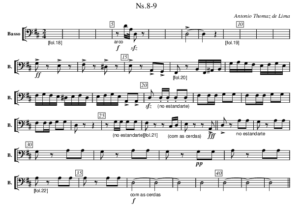 X:605 T:Ns.8-9 C:Antonio Thomaz de Lima M:2/4 L:1/4 K:D V: 5 clef=bass name="Basso" sname="B." %%MIDI program 1 42 %%staves [ 5 ] %----------- edit between the lines ------------ "_[fol.18]" X | X | X | X | "_arco" !f! z/ D1/4A,1/8 !sfz! D,/ z/ | X | X |\ (!>!D,2 | D,) z |"_[fol.19]" X | X | X | X | !ff! !>!G,/ z/ !>!E,/ z/ |\ !>!F,/ z/ !>!^D,/ z/| !>!E,/ z/ !>!A,,/!>!G,,/ | "_[fol.20]" F,,/ z/ B,,//F,,//^A,,//B,,// |\ G,//A,//G,//F,// E,//F,//G,//E,// | F,//G,//F,//E,// ^D,//E,//F,//D,// |\ E,//F,//G,//E,// !>!A,,/!>!A,,/ | !sfz! D,/ "_(no estandarte)" .D,//.D,// .D,/.D,/ |\ F,/F,//F,// G,/G,/ | F,/F,//F,// G,/G,/ | F,/F,//F,// G,/G,/ | D,/ z/ z |\ z/ "_(no estandarte)" G,//G,// G,/G,/ | "_[fol.21]" F,/ z/ z/ "_(com as cerdas)" C,//D,// |\ E,/ z/ z/ !fff! !>!A,,/ || !>!D,/ z/ "_no estandarte" A,/A,/ | G,/ z/ A,/A,/ | G,/ z/ A,/A,/ |\ G,/ z/ A,/A,/ | G,/ z/ !pp! G,/G,/ |A,/ z/ A,/A,/ |"_[fol.22]" A,/ z/ A,/A,/ | A,/ z/ A,/A,/ |\ !f! "_com as cerdas" (D,2 | (D,2) | D,2) | D,2 | (D,2 | (D,2)| D,2) ||\ %-----------------------------------------------