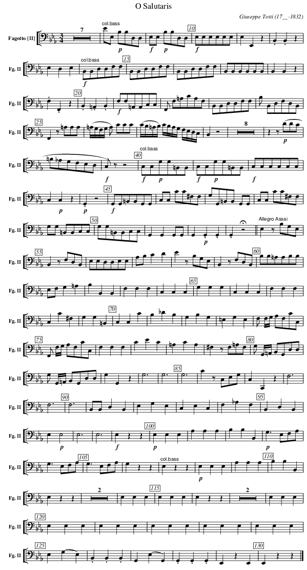 X:215 T:O Salutaris C:Giuseppe Totti (17__-1832) M:3/4 L:1/4 K:Eb V: 15 clef=bass name="Fagotto [II]" sname="Fg. II" %%MIDI program 1 68 %%staves [( 15 )] [V: 15] %----- edit between the lines ---- Z7 | "^col.bass" E/E,/ !p! B,/B,/D,/D,/ | !f! E,/E,/ !p! B,/B,/D,/D,/ | !f! E,/E,/E,/E,/E,/E,/ | E, E,, z | .B,, .B,, z | E, D, E, | "^col.bass" !f! B,,/B,,/D,/D,/F,/F,/ | B,,/B,,/D,/D,/F,/F,/ | B,,/B,,/D,/D,/F,/F,/ | B,,/B,,/B,,/B,,/B,,/B,,/ | B,, B,, z | .F, .F,, z | .B,, .=A,, .B,, | !f! F,/F,/=A,,/A,,/C,/C,/ | F,,/ F,/=A,/C/A,/F,/ | B,,/B,,/D,/D,/F,/F,/ | B,/ B,,/D,/F,/D,/B,,/ |F,, z/ =A,/A,/A,/ | (=A,//G,//F,//G,// A,/) C/C/C/ | (C//B,//=A,//B,//) C//B,//A,//G,// F,//E,//D,//C,// | B,, z2 | Z8 | z z/ !p!(D/D/C/|=B,/_A,/G,/F,/E,/D,/ | !f!C,/) z/ z2 | "^col.bass" !f! C,/C,/!p!G,/G,/=B,,/B,,/ | !f! C,/C,/!p!G,/G,/=B,,/B,,/ | !f! C,/C,/C,/C,/C,/C,/ | C, !p! C, z | !p! .G,, z2 | !f! G,,/G,,/=B,,/B,,/G,,/G,,/ | C,/C,/ C/C/^F,/F,/ | G,/G,,/=B,,/B,,/ G,,/G,,/ | C,/C,/ C/C/^F,/F,/ | G,/G,/ =B,,/B,,/C,/C,/ | G,/G,/=B,,/B,,/C,/C,/ | G,,G,, G,,/G,,/ | G,, !p!.G,, .G,, | .G,, !fermata!z2 || "^Allegro Assai" E, z/ B,/G,/E,/ | B,, z/ F,/D,/B,,/ | E,/E,/D,/D,/E,/E,/ | A,/B,/ C D | E z/ B,/G,/E,/ | B,, z/ F,/D,/B,,/ | B,/B,/=A,/A,/B,/B,/ | E,/F,/ G, =A, | B, B,, B,, | F, F, F, | C, C, C, | G, G, G, | C, C, C, | F, F, F, | C, C ^F, | G, G, =B,, | C, C, C | B, _D B, | G, B, G, | =E, G, E, | F,/ F,//G,// A,/F,/C/C,/ | F,,/ F,//G,// A,/F,/C/C,/ | F, F, F, | C E C | =A, C A, | ^F, z/ F,/=A,/F,/ | G,/ G,,//=A,,// B,,/G,,/D,/D,/ | G,/ G,,//=A,,// B,,/G,,/D,/D,/ | G, G,, z | G,2> | G,4> | G,4>| C2 z/ C,/E,/G,/ | C, C,, z | F,2> | F,4> | F,4> | B,,B,,/ D, B,, | E, G, E, | C, E, C, | F, _A, F, | B,, D, B,, | E, !p! E,2 | E,2> | E,4> | !f! E,2 z z | !p!E, E, E,| A, A, A, | B, B, B,, | !p!G,> E,F,/A,/ | G,> E,F,/A,/ | G,> E,F,/A,/ | G, z z | "^col.bass" E, z z | !p! E, E, E, | A, A, A, | B, B, B,, | E, z z | Z2 | E, E, E, | E, E, E, | E, z z | Z2 | E, E, E, | E, E, E, | E, E, E, | E, E, E, | E, E, E, | E, E, E, | E, (G, E,) | .B,, .B,, .B,, | G,, (E, G,,) | .G,, .G,, .G,, | E,, z E,, | E,, z z |] %----------------------------------
