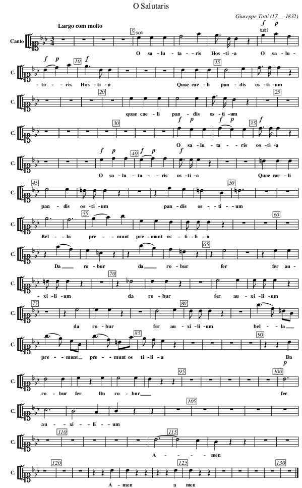 X:227 T:O Salutaris C:Giuseppe Totti (17__-1832) M:3/4 L:1/4 K:Eb V: 27 clef=alto1 name="Canto" sname="C." %%MIDI program 1 1 %%staves [[ 27 ]] %----- edit between the lines ---- [Q:"Largo com molto"] z3|z3| z3|\ z3| "^soli" ccc|d2f| e/2> B/2 B z|\ w: O sa-lu-ta-ris Hos-ti-a "^tutti" !f! e !p!f d| !f!(B!p!d) f | !f!e>BB|\ w: O sa-lu-ta--ris Hos-ti-a z3|z3|z3| BBB | B2 c| d/2 >d/2dz|\ w: Quae cae-li pan-dis os-ti-um z3|z3| z3 |z3 | ccc| c2 c |\ w: quae cae-li pan-dis d/2 >c/2 B z|z3|z3|z3|z3|z3|\ w: os-ti-um z3 |z3 | z3 | z3| !f!d!p!cc| !f!(d!p!c)c|\ w: O sa-lu-ta--ris !f!d/2 >d/2dz| z3 |z3 | z3 | !f!c!p!dd| !f!(c!p!d)d| w:os-ti-a O sa-lu-ta--ris !f!c/2 >c/2c z| z3 |z3 | =BBB |c2c| =B/2 B/2Bz |\ w: os-ti-a Quae cae-li pan-dis os-ti-um z3 | zdc|=B2G| =B3| z3 | z3 |\ w:pan-dis os-ti-um e3|d3|(ef)g|ccB|B/2 B/2Bz|z3 | z3| z3|\ w:Bel-la pre--munt pre-munt os-ti-li-a z(fd)|c=Az|z(ge)|d=Bz|zc2|z3| zcc| =B/ B/ B z|\ w:Da_ro-bur da_ro-bur fer fer au-xi-li-um z3|z_B2| BBz|z3| c2c| c/2 c/2cz|z3| zc2|\ w:da ro-bur fer au-xi-li-um da ccz|z3| B2c| B/2 B/2 B z|z3|(g>d) =B/2G/2| (g>e) c/2G/2| (g>d) =B/2f/2| w:ro-bur fer au-xi-li-um bel--la_ pre--munt_ pre--munt os e/2 d/2cz| z3 |z3|z3|z3| zzB | B2B| czc| w:ti-li-a Da ro-bur fer Da c2c|Bzz|z3|z3|z3|z3|z3|!p!B3| A3| G2F|Gzz|z3|z3|z3|z3|z3|\ w:ro-bur_ fer au-xi-li-um z3|z3|z3|z3|z3|(B3|B2)A|Gzz| w: A---men z3|z3|z3|z3|z3|zzB|Bzz|zzB|\ w: A-men a Bzz | z3|z3|z3|z3|z3|] w:men %---------------------------------