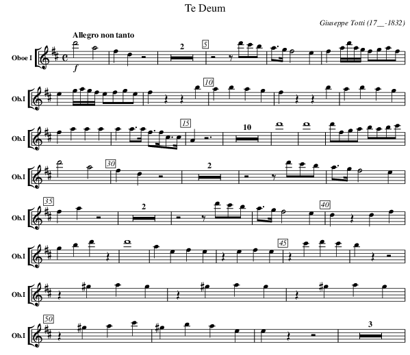 X:303 T:Te Deum C:Giuseppe Totti (17__-1832) M:C L:1/4 K:D V: 3 clef=treble name="Oboe I" sname="Ob.I" %%MIDI program 1 68 %%staves [( 3 )] %----- edit between the lines ---- [Q:"Allegro non tanto"] !f! d'2 a2 | f d z2 | Z2 | z2 z1/2 d'1/2c'1/2b1/2 | a3/4g1/4 f2 e | f a1/4d'1/4a1/4g1/4 f1/2g1/2a1/2f1/2 | e g1/4a1/4g1/4f1/4 e1/2f1/2g1/2e1/2 | f z z b | a b a g | f z z b | a b a g | f a a a | a a3/4a1/4 f3/4f1/4c3/4c1/4 | A z3 | Z10 | d'4 | d'4 | d'1/2f1/2g1/2a1/2 b1/2a1/2b1/2c'1/2 | d'2 a2 | f d z2 | Z2 | z2 z1/2 d'1/2c'1/2b1/2 | a3/4g1/4 f2 e |f a z2 | Z2 | z2 z1/2d'1/2c'1/2b1/2 | a3/4g1/4 f2 e | d z d f | g b d' z | d'4 | a e f e | z e f e | z c' d' c' | b z z2 | z ^g a g | z ^g a g | z ^g a g | z ^g a c' | ^g b a e | e zz2 | Z3 | %---------------------------------