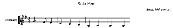 X:202 T:Solo Fem C:Anon, 16th century M:3/4 L:1/8 K:G V: 2 clef=treble name="Contralto" sname="C." %%MIDI program 1 1 %%staves [ 2 ] %------ G3 FE2| D2C2B,2| G,2 A,4| G,4 G,2| %------
