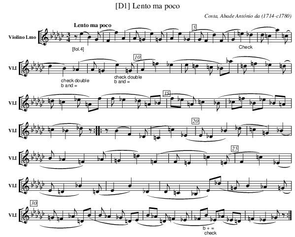 X:201 T:[D1] Lento ma poco C:Costa, Abade António da (1714-c1780) M:3/4 L:1/4 K:Gb V: 1 clef=treble name="Violino I.mo" sname="Vl.I" %%MIDI program 1 40 %%staves [ 1 ] %----- edit between the lines ---- [Q:"Lento ma poco"] "_[fol.4]" z/ (eB)(G/ | F f) (A | A/ =G e) (=G/ | Ae) (_G | G/ F d) (F/ | G "_Check" =e) (_d | d/ =c a) (=c/ | d "_check double" "_b and =" B) (_A | A/ =G "_check double" "_b and =" e) (=G/ | A =f) (_e | e/ =d =c/ _B/)(_a/ | =d/ =f _e) (=d/ | =d/ =c _e/ =A/)(f/ | f/ _e _d/ =A/)(_B/ | f/_e/ =A/) =c (_B/ | _c/=f/ _B/_e/ _B/)=A/ | (=c _B _d/)z/ :|: z/ (B F) (_D/ | =C =c) (_E | E/ _D _B) (_d/ | =c =G) (_B | B/ _A =F) (_A/ | =G =d) (=F | F/ =E =c) (=E/ | F =c) (_E | E/ =D _B) (=D/ | E B) (_D | D/ =C _B,/ E/)(_d/ | =G/ B _A) (=G/ | =G/ =F _A/ =D/)(B/ | B/ _A _G/ =D/)(E/ | B/_A/ =D/) (=F _E/ | _F/"_b + = ; check"B/ _E/)/(_A/ _E/=D/) | (=F _E _G/) z/ :| %---------------------------------
