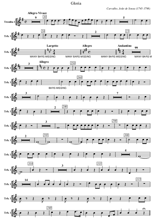 X:205 T:Gloria C:Carvalho, Jo\~ao de Sousa (1745-1798) M:C L:1/4 K:G V: 5 clef=treble name="Tromba I" sname="Trb. I" %%MIDI program 1 56 %%staves [( 5 )] %------------------- [Q: "Allegro Vivace"] Z9 | d d/d/ d>e | f/e/d/A/2 d/e/f/e/ | d z d d | Z5 | \ e2 d d | d z z d | d z z d | d z2 z | Z2 | d2 d d/d/ | d2 d d/d/ | \ "_MANY BARS MISSING" X42 || [Q:"Largetto"] [K: Bb][M: 3/4] "_MANY BARS MISSING" X28 || \ [Q:"Allegro"] [K:G] [M:C] "_MANY BARS MISSING" X51 || \ [Q:"Andantino"] [K:D] [M:3/4] "_MANY BARS MISSING" Z99 | Z3||\ [Q:"Allegro"] [K:C] [M:C] z B/2B/2 B B | z c/2c/2 c c | B z B z | c z c c | d z d d | \ "_BARS MISSING" X5 | c2 c c | c c/2c/2 d d | c c/2c/2 d d |\ c z z2 | Z3 | d2 c2 | B z B z | B B B z | Z7 | z2 z c | d z B z | Z2 | z c c c/2c/2 | \ c z z2 | z c c c/2c/2 | c z z2 | Z3 | F4 | c c/2c/2 c/2c/2c/2c/2 | c z z2 | Z | c c/2c/2 c z | Z2 | \ (F4 | F4) | Z | (F4 | F) c c c/2c/2 | c z z2 | c2 c c/2c/2 | c c/2c/2 c c | c z c z |\ c c c z | Z4 | (F4 | F4) | B z z2 | Z3 | B z B z | B B B z | D z z2 | Z14 | B B/2B/2 B B | B z z2 | \ d B/2B/2 B B | B z z2 | Z | B/2 z/2 z B/2 z/2 z | B/2 z/2 z B/2 z/2 z | B z c c/2c/2 | B z B z | \ c z d d/2>c/2 | B B B D/2F/2 | B B B !fermata! z ||\ %-------------------