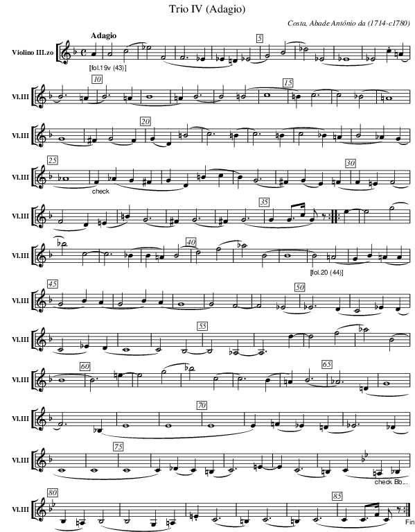 X:303 T:Trio IV (Adagio) C:Costa, Abade António da (1714-c1780) M:C L:1/4 K:F V: 3 clef=treble name="Violino III.zo" sname="Vl.III" %%MIDI program 1 40 %%staves [ 3 ] %----- edit between the lines [Q:"Adagio"] "_[fol.19v (43)]" A | \ A2 (c2 | _e2) (F2 | F3_E | _E=D) (_E2 | G2) (B2 | _d2) (_E2 | _E4 | _E2) .c (=A | B3) (=A | B3) (=A | B4 | =A) (B3 | B2) (=B2 | c4 | =B) (c3 | c2) (_B2 | =A4) | (G4 | ^F) (G2 F) | (GD) (=B2 | c3) (=B | c3) (=B | c2 _B) (=A | B2 _A) (G | _A4 | "_check" F) (_AG^F | GD) (=Bc | B) (G3 | ^F) (GE) (=F | F =E) (F2 | F2 D) (=E | =B) (G3 | ^F)(G3 | ^F) (G3 | G G/>c/ G/)z/ :|: e- | e2 (g2 | _b2) c2- | c3 (_B | B=A) (B2 | d2) (f2 | _a2) (B2 | B4 | "_[fol.20 (44)]" B2) (=A2 | GB)(=AA | G2 B)(A | G2B)(A | G4 | G2) F2- | F2 (_E2 | _E3)(D | C2_E)(D | C2_E)(D | C4 | C2) B,2- | B,2 _A,2- | A,3d- | d2 (f2 | _a2) (B2 | B4 | B3) =e- | e2 (g2 | _b2) (c2 | c3) (B | =A) (B3 | _A3) (=D | G4 | F3) (_B, | E4 | E4 | E4 | E) (=F _E) (=D | _E3) (_D | C4 | C4 | C4 | C) (_DC) (=B, | C3) =E- | E (C3 | =B,) (C [K: Bb] "_check Bb..." =A,_B, | B,=A,) (B,2 | B,2 G,=A,) | .=E (C3 | =B,) (C3 | =B,) (C3 | C C/>F/ C/)z/ "_Fine" :|] \ %---------------------------------