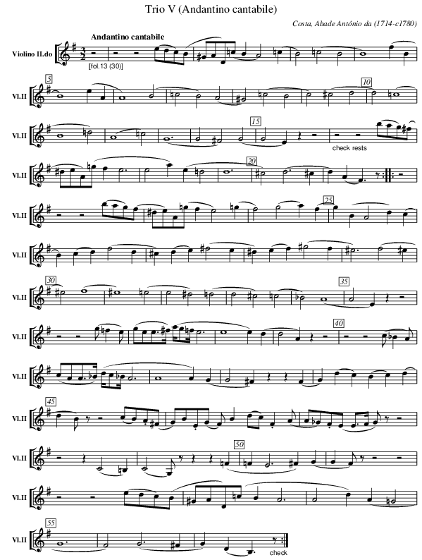 X:402 T:Trio V (Andantino cantabile) C:Costa, Abade António da (1714-c1780) M:3/2 L:1/2 K:G V: 2 clef=treble name="Violino II.do" sname="Vl.II" %%MIDI program 1 40 %%staves [ 2 ] %----- edit between the lines [Q:"Andantino cantabile"] "_[fol.13 (30)]" z | z z (e//d//c//)(B// | ^G//A//D//)(=c// B/ A) (=c/ | B) (=cB | B2) (f/B/ | B2) (e/A/ | A2) (B | =cB) (A | ^G) (=cB | c) (^c d | d) (=c2 | B2 =d) | (A2 =c) |(G3 | G ^F) (G | G E/)z/ z | "_check rests" z z (b//a//g//)(^f// | ^d//e//A//)(=g// f < e | e a/) (e/=d | d3 | ^c) (d>^c | d/) (A/F/>)z/ :|: z | z z (b//a//g//)(f// | ^d//e//)A//(=g// f/e) (=g/ | f) (g a/) (f/ | g/) (B/ A d/) (c/ | B/) (c/ d/) (f d/ | ^c/) (d/ e/) (^f e/ | ^d/) (e/ f/) (^g f/ | ^e3/2) (f ^e/ | ^e) (f2 | ^e2) (=e | e ^d) (=d | d ^c) (=c | _B) (A2 | A E/)z/ z | z z (g// =f/ e//) | (g//e//e//>^f//) (a/8g//=f/8 e3/2 | e2 e/) (d/ | d A/) z/ z | z z (c// _B/ A//) | (c//A//A//>_B//) (d/8c//_B/8 A3/2 | A2 A/) (G/ | G ^F/) z/ z/ (F/ | G/) (d/ c/) (B/ c/) (d/ | d/ B//) z// z (c//B//).A//(^F// | G//)B//.E//(G// F//) B/ (d//c//) .F/ (A// | A//_G//).F//(E// E//>F// G//)z// z | z z/ (C=B,/) | (C G,//) z// z/ z/ (=F/ | =F/ E > ^F) (G/ | G/ F//) z// z z | z z (e//d//c//)(B// | ^G//A//D//)(=c// B < A | Ad/) (A/ =G | G3 | F) (G > ^F | G/) (D/ B,/ > ) "_check" z/ :|] %---------------------------------