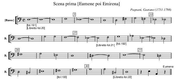 "_[fol.193]" ^F,4 | ^G,4 | A,4 | A,2 "_[Libretto fol.22]" ^C,2 | D,4 | zE,A,, "^Eumene" z ||