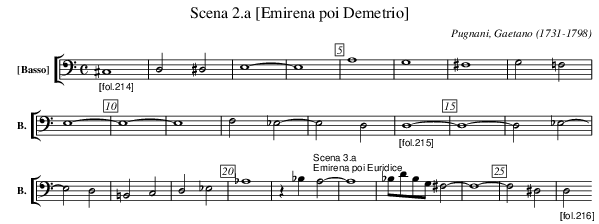 X:1614 T:Scena 2.a [Emirena poi Demetrio] C:Pugnani, Gaetano (1731-1798) M:C L:1/4 K:C V: 14 clef=bass name="[Basso]" sname="B." %%MIDI program 1 42 %%staves [ 14 ] %----- "_[fol.214]" ^C,4 | D,2 ^D,2 | E,4- | E,4 | A,4 | G,4 | ^F,4 | G,2 =F,2 | E,4- | E,4- | E,4 | F,2 _E,2- | E,2 D,2 | \ "_[fol.215]" D,4 - | D,4 - | D,2 _E,2- | E,2 D,2 | =B,,2 C,2 | D,2 _E,2 | _A,4 | z _B, "^Scena 3.a;Emirena poi Euridice" A,2- | A,4 | _B,/D/B,/G,/ ^F,2 - | F,4 - | F,2 ^D,2 | \ "_[fol.216]" D,2 \ %-----
