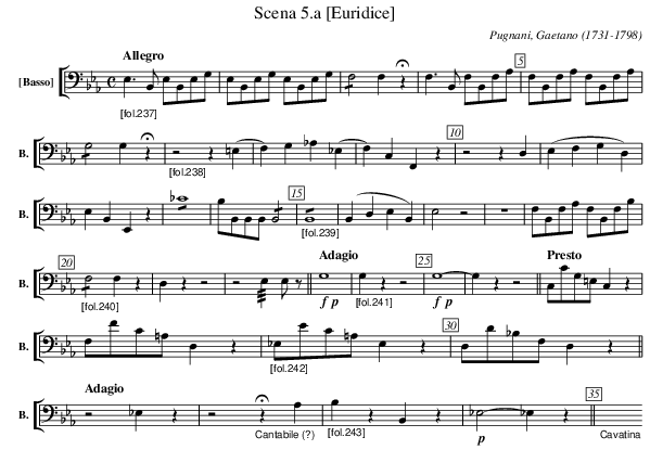 X:1914 T:Scena 5.a [Euridice] C:Pugnani, Gaetano (1731-1798) M:C L:1/4 K:Eb V: 14 clef=bass name="[Basso]" sname="B." %%MIDI program 1 42 %%staves [ 14 ] %--------------------------------------------- [Q:"Allegro"] "_[fol.237]" E,>B,, E,/B,,/E,/G,/ | E,/B,,/E,/G,/ E,/B,,/E,/G,/ | !/!F,2F,!fermata!z | \ F,>B,, F,/B,,/F,/A,/ | F,/B,,/F,/A,/ F,/B,,/F,/A,/ | !/!G,2G,!fermata!z |\ "_[fol.238]" z2z(=E, | F,)G,_A,(_E, | F,)C,F,,z | z2zD, | (E,F,G,D,) | E,B,,E,,z | !/!_C4 | \ B,/B,,/B,,/B,,/!/!B,,2 |\ "_[fol.239]" !/!B,,4|(B,,D,E,B,,)|E,2z2|Z| F,/B,,/F,/A,/ F,/B,,/F,/B,/ | \ "_[fol.240]" !/! F,2 F, z | D, z z2 | z2 !///!E, E,/z/ || [Q:"Adagio"] !f! !p! G,4 | \ "_[fol.241]" G, zz2 | !f!!p! G,4 - | G, zz2 || [Q:"Presto"] C,/C/G,/=E,/ C, z | F,/F/C/=A,/ D, z | \ "_[fol.242]" _E,/E/C/=A,/ E, z | D,/D/_B,/F,/ D, z || [Q:"Adagio"] z2 _E, z | z2 !fermata! "_Cantabile (?)" z A, | \ "_[fol.243]" B, z B,, z | !p! _E,2-_E, z || "_Cavatina" x \ %---------------------------------------------
