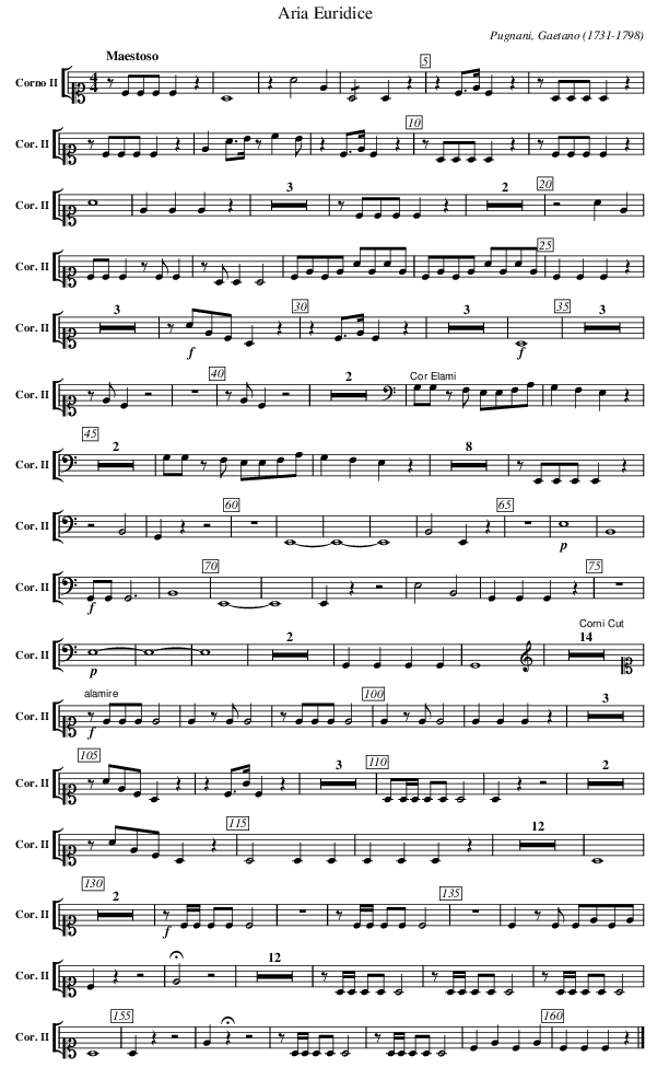 X:2502 T:Aria Euridice C:Pugnani, Gaetano (1731-1798) M:4/4 L:1/4 K:A V: 2 clef=alto name="Corno II" sname="Cor. II" %%MIDI program 1 69 %%staves [( 2 )] %----------------------- [Q:"Maestoso"][K:alto1][K:C] z/C/C/C/ Cz | A,4 | z A2E | !/! A,2 A, z | z C/>E/ Cz | \ z/A,/A,/A,/ A, z | z/C/C/C/ C z | E A/>B/ z/ cB/ | zC/>E/ C z | z/A,/A,/A,/ A, z | z/C/C/C/ C z | A4 | \ EEEz | Z3 | z/C/C/C/ Cz | Z2 | z2 A E | C/C/Cz/ C/C | z/A,/ A, A,2 | C/E/C/E/ A/E/A/E/ | C/E/C/E/ A/E/A/E/ | \ CCCz | Z3 | z/!f!A/E/C/ A, z | z C/>E/C z | Z3 | !f! A,4 |Z3 | z/E/ Cz2 | Z | z/E/ Cz2 | Z2 | \ "^Cor Elami" [K:bass] G,/G,/ z/F,/ E,/E,/F,/A,/ | G,F,E,z | Z2 | G,/G,/ z/F,/ E,/E,/F,/A,/ | G,F,E,z | Z8 | \ z/E,,/E,,/E,,/ E,, z | z2 B,,2 | G,,zz2 | Z | E,,4- | E,,4- | E,,4 | B,,2E,,z | Z | \ !p! E,4 | B,,4 | !f! G,,/G,,/ G,,3 | B,,4 | E,,4- | E,,4 | E,,zz2 | \ E,2 B,,2 | G,,G,,G,,z | Z | !p! E,4- | E,4- | E,4 | Z2 | G,,G,,G,,G,, | G,,4 | \ [K:treble] "^Corni Cut" Z14 | "^alamire" [K:alto1] !f!z/E/E/E/ E2 | E z/E/E2 | \ z/E/E/E/ E2 | E z/E/E2 | EEEz | Z3 | z/A/E/C/ A,z | z C/>G/ Cz | Z3 | A,/A,//A,// A,/A,/ A,2 | A,zz2 | Z2 | \ z/A/E/C/ A,z | A,2A,A, | A,A,A,z | Z12 | A,4 | Z2 | !f! z/ C//C// C/C/ C2 | Z | z/ C//C// C/C/ C2 |\ Z | C z/C/ C/E/C/E/ | Czz2 | !fermata! E2 z2 | Z12 | z/A,//A,// A,/A,/ A,2 | z/A,//A,// A,/A,/A,2 | \ z/A,//A,// A,/A,/ A,2 | A,4 | A,zz2 | E !fermata! z z2 | \ z/A,//A,// A,/A,/ A,2 | z/A,//A,// A,/A,/ A,2 | CECE | CCCz|] %-----------------------