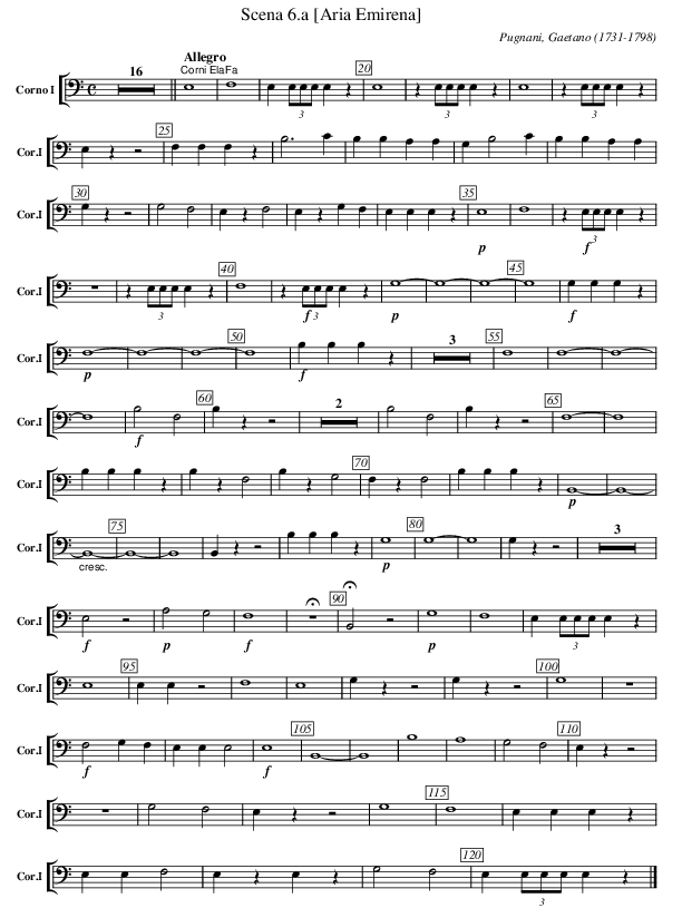 X:2601 T:Scena 6.a [Aria Emirena] C:Pugnani, Gaetano (1731-1798) M:C L:1/4 K:C V: 1 clef=alto name="Corno I" sname="Cor.I" %%MIDI program 1 69 %%staves [( 1 )] %------------------------ [K: bass] Z16 || "^Corni ElaFa" \ [Q: "Allegro"] E,4 | F,4 | E,(3E,/E,/E,/ E, z | E,4 | z(3E,/E,/E,/ E, z | \ E,4 | z(3E,/E,/E,/ E, z | E, z z2 | F,F,F,z | B,3C | B,B, A,A, |G,B,2 C | \ B,B, A,A, | G, zz2 | G,2 F,2 | E, z F,2 | E,zG, F, | E,E,E,z | \ !p! E,4 | F,4 | z !f! (3E,/E,/E,/ E, z | Z | z (3E,/E,/E,/ E, z | F,4 | \ z !f! (3E,/E,/E,/ E, z | !p! G,4- | G,4- | G,4- | G,4 | !f! G,G,G,z | !p! F,4- | \ F,4- | F,4- | F,4 | !f! B,B,B,z | Z3 |F,4 | \ F,4- | F,4- | F,4 | !f! B,2 F,2 | B,zz2 | \ Z2 | B,2 F,2 | B,zz2 | F,4- | F,4 | B,B,B,z | \ B,zF,2 | B,zG,2 | F, z F,2 | B,B,B,z | !p! B,,4- | B,,4- | "_cresc." B,,4- | \ B,,4- | B,,4 | B,,zz2 | B,B,B,z | !p! G,4 | G,4- | G,4 | G,zz2 | \ Z3 | !f! E,2 z2 | !p!A,2 G,2 | !f! F,4 | \ !fermata! Z | !fermata! B,,2z2 | !p! G,4 | F,4 | E,(3E,/E,/E,/ E, z | E,4 | \ E,E, z2 | F,4 | E,4 | G, zz2 | G, zz2 | G,4 | \ Z | !f! F,2 G, F, | E,E,E,2 | !f! E,4 | B,,4- | B,,4 | B,4 | \ A,4 | G,2 F,2 | E, zz2 | Z | G,2 F,2 | E, zz2 | G,4 | \ F,4 | E,E,E,z | E,E,F,2 | E, zE, z | G,2 F,2 | E, (3E,/E,/E,/ E,z |] %------------------------