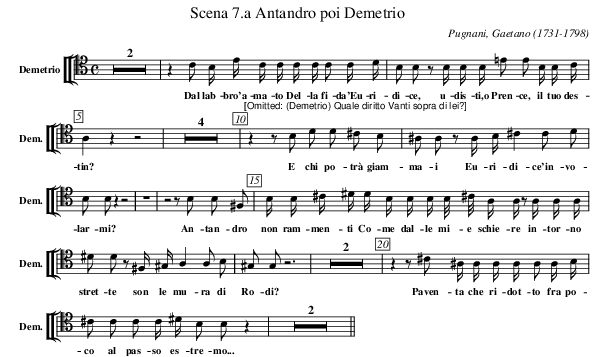 X:2719 T:Scena 7.a Antandro poi Demetrio C:Pugnani, Gaetano (1731-1798) M:C L:1/4 K:C V: 19 clef=tenor name="Demetrio" sname="Dem." %%MIDI program 1 1 %%staves [[ 19 ]] %------------------ [L:1/8] Z2 | z2 C B,/ E/ C/ C/ C/ C/ C C/ D/ | B, B, z\ w: Dal lab-bro'a-ma-to Del-la fi-da'Eu-ri-di-ce, B,/ B,/ B,/ =E E B,/2 B,/ C/ | A,2 z2 z4 | Z4 | "^[Omitted: (Demetrio) Quale diritto Vanti sopra di lei?]" z2 z w: u-dis-ti,o Pren-ce, il tuo des-tin? B, D D ^C B, | ^A, A, z w: E chi po-tr\`a giam-ma-i A,/ B,/ ^C2 C D | B, B, z2 z4 | \ w: Eu-ri-di-ce'in-vo-lar-mi? Z | z4 zB, B, ^F, | B,/ B,/ ^C/ ^D/ D/ B,/ B,/ B,/ B,// ^C// A,/ A,/ z A,/ A,/ A,/ | w: An-tan-dro non ram-men-ti Co-me dal-le mi-e schie-re in-tor-no ^D D z ^F,/ ^G,/ A,2 A, B, | ^G, G, z6 | Z2 | z2 z ^C ^A,/ A,/ A,/ A,/ A, A,/ B,/ | ^C C C C/ ^D/ B, B, z2 | Z2 || w: stret-te son le mu-ra di Ro-di? | Paven-ta che ri-dot-to fra po-co al pas-so es-tre-mo... %------------------