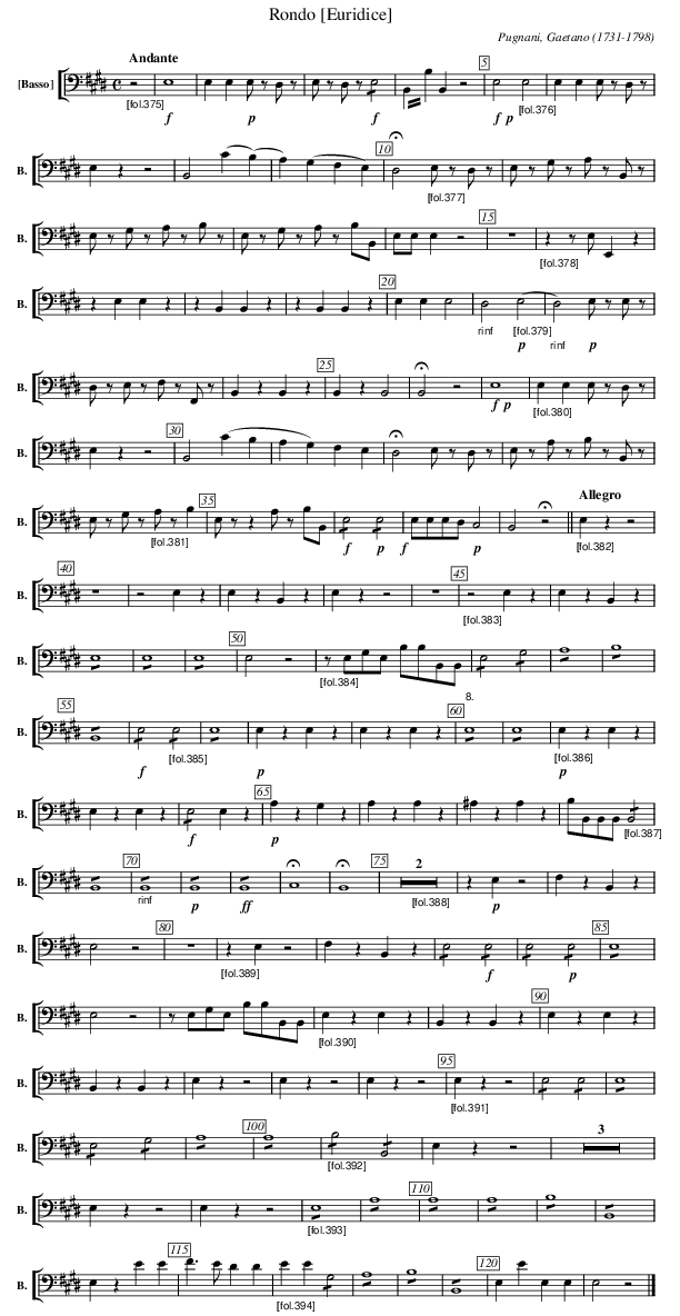 X:3814 T:Rondo [Euridice] C:Pugnani, Gaetano (1731-1798) M:C L:1/4 K:E V: 14 clef=bass name="[Basso]" sname="B." %%MIDI program 1 42 %%staves [ 14 ] %--------------------------- "_[fol.375]" [Q:"Andante"] z2 | !f! E,4 | E,E,!p!E,/z/ D,/z/ | E,/z/ D,/z/ !f! !/!E,2 | B,,/!trem2!B,/ B,,z2 | !f!!p!E,2 \ "_[fol.376]" E,2 | E,E,E,/z/ D,/z/ | E,zz2 | B,,2 (C(B,) | A,)(G,F,E,)| !fermata! D,2 \ "_[fol.377]" E,/z/ D,/z/ | E,/z/ G,/z/ A,/z/ B,,/z/ | E,/z/ G,/z/ A,/z/ B,/z/ | E,/z/ G,/z/ A,/z/ B,/B,,/| E,/E,/E,z2 | Z |\ "_[fol.378]" z z/E,/ E,,z | z E,E, z | zB,,B,,z | zB,,B,,z| E,E,E,2| "_rinf" D,2 \ "_[fol.379]" !p! (E,2 | "_rinf" D,2) !p! E,/z/ E,/z/ | D,/z/ E,/z/ F,/z/ F,,/z/ | B,,zB,,z | B,,zB,,2 | !fermata! B,,2z2 | !f!!p!E,4 | \ "_[fol.380]" E,E,E,/z/ D,/z/ | E,zz2 | B,,2(CB,|A,G,)F,E, | !fermata!D,2E,/z/ D,/z/ | E,/z/ A,/z/ B,/z/ B,,/z/ | E,/z/ G,/z/ \ "_[fol.381]" A,/z/ B, | E,/z/ z A,/z/ B,/B,,/ | !f! !/!E,2 !p! !/!E,2 !f!| E,/E,/E,/D,/ !p!C,2 | B,,2!fermata! z2 || \ "_[fol.382]" [Q:"Allegro"] E,zz2 | Z | z2E,z | E,zB,,z | E,zz2 | Z | \ "_[fol.383]" z2E,z | E,zB,,z | !/!E,4 | !/!E,4 | !/!E,4 | E,2z2 | \ "_[fol.384]" z/E,/G,/E,/ B,/B,/B,,/B,,/ | !/!E,2 !/!G,2 | !/!A,4 | !/!B,4 | !/!B,,4 | !f! !/!E,2 \ "_[fol.385]" !/!E,2 | !/!E,4 | !p! E,zE,z | E,zE,z | !/!"^8." E,4 | !/! E,4 | \ "_[fol.386]" !p! E,zE,z | E,zE,z | !f! !/! E,2E,z | !p! A,zG,z | A,zA,z | ^A,zA,z | B,/B,,/B,,/B,,/ \ "_[fol.387]" !/! B,,2 | !/! B,,4 | "_rinf" !/! B,,4 | !p! !/! B,,4 | !ff! !/! B,,4 | !fermata! C,4 | !fermata! B,,4 | \ "_[fol.388]" Z2 | z !p! E, z2 | F,zB,,z | E,2z2 | Z | \ "_[fol.389]" zE,z2 | F,zB,,z | !/! E,2 !f! !/! E,2 | !/! E,2 !p! !/! E,2 | !/! E,4 | E,2 z2 | z/E,/G,/E,/ B,/B,/B,,/B,,/ | \ "_[fol.390]" E,zE,z | B,,zB,,z | E,zE,z | B,,zB,,z | E,zz2 | E,zz2 | E,zz2 | \ "_[fol.391]" E,zz2 | !/! E,2 !/! E,2 | !/! E,4 | !/! E,2 !/! G,2 | !/! A,4 | !/! A,4 | \ "_[fol.392]" !/! B,2 !/! B,,2 | E,zz2 | Z3 | E,zz2 | E,zz2 | \ "_[fol.393]" !/! E,4 | !/! A,4 | !/! A,4 | !/! A,4 | !/! B,4 | !/! B,,4 | E,zEE | F>EDD | "_[fol.394]" EE !/!G,2 | !/! A,4 | !/! B,4 | !/! B,,4 | E,EE,E, | E,2z2 |] %---------------------------
