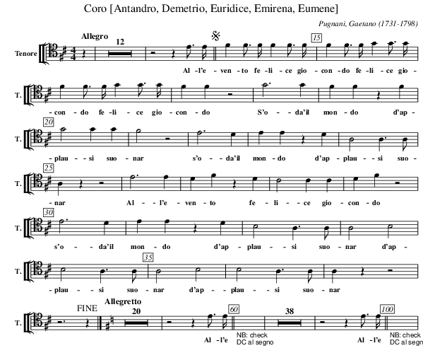 X:4017 T:Coro [Antandro, Demetrio, Euridice, Emirena, Eumene] C:Pugnani, Gaetano (1731-1798) M:4/4 L:1/4 K:D V: 17 clef=tenor name="Tenore" sname="T." %%MIDI program 1 1 %%staves [[ 17 ]] %------------------- [Q:"Allegro"] z | Z12 | z2zE/> E/ !segno!|| F F/> F/ F F/> F/ | F F/> F/ G G/> G/ | F F/> F/ G G/> G/ | FFz2| \ w:Al-l'e-ven-to fe-li-ce gio-con-do fe-li-ce gio-con-do fe-li-ce gio-con-do G3G | FFzF | G2GG | F2z2 | E3D | EEzD | A,2 A,>A, | A,zz2 | \ w:S'o-da'il mon-do d'ap-plau-si suo-nar s'o-da'il mon-do d'ap-plau-si suo-nar E3E | DFzD | C2 CC |DFz2 | E3D | EEzD | B,2A,>A, | A,2B,2 | B,2 A,>A, | A,2B,2 | B,2 A,>A, | A,zz2 | z3!fine!z |] \ %--- "^Questo Coro" "^si replica" "^p.due volte(...)" w:Al-l'e-ven-to fe-li-ce gio-con-do s'o-da'il mon-do d'ap-plau-si suo-nar d'ap-plau-si suo-nar d'ap-plau-si suo-nar [Q:"Allegretto"][K:G] Z20 | z2zE/> E/ ||\ w: Al-l'e "_NB: check" "_DC al segno" X | \ Z38 | z2zE/> E/ ||\ w: Al-l'e "_NB: check" "_DC al segno" X | \ %----------------