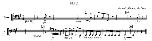 "_[fol. 28]" X | z "_pizz." !>!C,/ z/ | X4 |"_arco" z !>!C/!>!C,/ |\