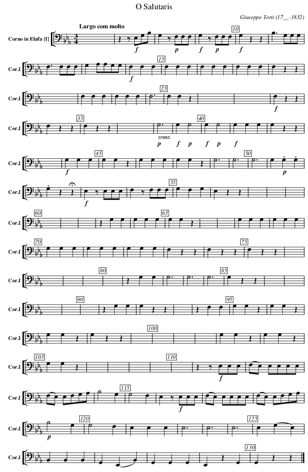 X:201 T:O Salutaris C:Giuseppe Totti (17__-1832) M:3/4 L:1/4 K:Eb V: 1 clef=bass name="Corno in Elafa [I]" sname="Cor.I" %%MIDI program 1 69 %%staves [( 1 )] %----- edit between the lines ---- [Q:"Largo com molto"] X6 | z z/ !f! E,/G,/B,/| G, z/ !p!F,/F,/F,/ | !f!G, z/ !p!F,/F,/F,/ | !f!G, z z | B,> G,G,/G,/|F,> F,F,/F,/| G, A,/A,/G,/G,/| !f!F,F,F,| F,F,F, | F,F,F,| F,F,F, | F,zz | X3 | F,F,F, | F,F,F, | F,3 | F,F,z | X3 | X4 | !f!F,zz | F,zz | F, z z | X2 | !p! "_ cresc" G,3 | !f!G,!p!G,2 | !f!G,!p!G,2 | !f!G,G,G, | G,zz | X | !f!G,G,G, | G,G,z | G,G,G, | G,G,z | G,3 | G,3 | G,3 | G,!p!.G,.G, | .G,z!fermata!z| !f!E,z/E,/E,/E,/ | F,z/F,/F,/F,/ | G,F,G, | E,zz | X | X | X | X | X | X | zG,G, | G,G,G, | G,G,z | X | X | G,G,G, | G,G,G, | G,G,G, | G,G,G, | G,G,G, | F,zz | F,zz | F,zz | X | X | X | X | X | zG,G, | G,3 | G,3 | G,3 | G,zz | X | X | X | X | X | zG,G, | G,zz | X | zF,F, | G,G,z | G,G,z | G,G,z | G,zz | X | X | X | X | G,G,z | G,G,z | G,G,z | X | X | X | X | X | zz/!f!E,/E,/E,/ | (F,/E,/) E,/E,/E,/E,/ | (F,/E,/) E,/F,/G,/A,/ | B,2G, | G,2F, | E,z/!f!E,/E,/E,/ | (F,/E,/) E,/E,/E,/E,/ | (F,/E,/) E,/F,/G,/A,/ | !p!B,2G, | G,2F, | E,E,E, | E,3 | E,3 | E,3 | E,(G,E,) | B,,B,,B,, | G,,(E,,B,,) | G,,G,,G,, | E,,zG,, | G,,zz |] %---------------------------------