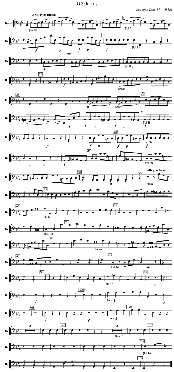 X:208 T:O Salutaris C:Giuseppe Totti (17__-1832) M:3/4 L:1/4 K:Eb V: 8 clef=bass name="Bassi" sname="B." %%MIDI program 1 42 %%staves [ 8 ] %----- edit between the lines ---- "_[fol.30]" [Q:"Largo com molto"] (E,/D,/E,/F,/G,/E,/) | \ (A,/G,/A,/C/A,/F,/) | (D,/B,,/D,/F,/D,/B,,/) |(E,/D,/E,/F,/G,/E,/) | \ "_[fol.31]"(A,/G,/A,/C/A,/F,/) | (D,/B,,/D,/F,/D,/B,,/) | (E,/B,,/G,,/)!f!E,/G,/B,/ |\ E/E,/ !p!B,/B,/D,/D,/ | !f!E,/E,/!p!/ B,/B,/D,/D,/ | !f!E,/E,/E,/E,/E,/E,/ |\ "_[fol.32]" E,E,,z | .B,,.B,,z | .E,.D,.E, | !f!B,,/B,,/D,/D,/F,/F,/ |\ B,,/B,,/D,/D,/F,/F,/ | B,,/B,,/D,/D,/F,/F,/ |\ "_[fol.33]" B,,/B,,/B,,/B,,/B,,/B,,/ | B,,B,,z | .F,.F,,z |\ .B,,.=A,,.B,, | !f!F,/F,/=A,,/A,,/C,/C,/ | F,,/ F,/=A,/C/A,/F,/ |\ "_[fol.34]" B,,/B,,/D,/D,/F,/F,/ | B,/ B,,/D,/F,/D,/B,,/ | F,F,,z |\ .F,.F,,z | .F,,zz | !p!(B,,/=A,,/B,,/C,/D,/A,,/) |\ "_[fol.35]" (B,,/=A,,/B,,/C,/D,/B,,/) | (E,/D,/E,/G,/E,/C,/) | (=A,,/F,,/A,,/C,/A,,/F,,/) |\ (B,,/F,,/D,,/) !f!B,,/D,/F,/ | !f!B,,/B,,/!p!F,/F,/=A,,/A,,/ | !f!B,,/B,,/!p!F,/F,/=A,,/A,,/ |\ "_[fol.36]" !f!B,,/B,,/B,,/B,,/B,,/B,,/ | B,,/B,,/B,,z | !p!.B,,.B,,z| .G,,zz |\ !f!C,/C,/!p!G,/G,/=B,,/B,,/ | !f!C,/C,/!p!G,/G,/=B,,/B,,/ |\ "_[fol.37]" !f!C,/C,/C,/C,/C,/C,/ | C,!p!C,z | !p!.G,,zz | !f!G,,/G,,/=B,,/B,,/G,,/G,,/ |\ C,/C,/ C/C/^F,/F,/ | G,/G,,/=B,,/B,,/G,,/G,,/ |\ "_[fol.38]" C,/C,/ C/C/^F,/F,/ | G,/G,/ =B,,/B,,/C,/C,/ | G,/G,/=B,,/B,,/C,/C,/ |\ !/!G,,2 G,,/G,,/ | G,, !p!.G,,.G,, | .G,,z!fermata!z |\ "_[fol.39]" [Q:"Allegro Assai"] E,z/B,/G,/E,/| B,,z/F,/D,/B,,/ | E,/E,/D,/D,/E,/E,/ |\ A,/B,/C D | Ez/B,/G,/E,/| B,,z/B,,/D,/F,/| B,/B,/=A,/A,/B,/B,/| E,/F,/G, =A,|\ "_[fol.40]" B,B,,B,, | F,F,F,| C,C,C, | G,G,G,|C,C,C,|F,F,F,| C,C^F,|G,G,=B,,|\ "_[fol.41]" C,C,C|B,_DB,| G,B,G,|=E,G,E,| F,/ F,//G,// A,/F,/C/C,/ |\ F,,/ F,//G,// A,/F,/C/C,/ | F,F,F, | CEC|\ "_[fol.42]" =A,CA,| ^F,z/F,/=A,/F,/| G,/ G,,//=A,,// B,,/G,,/D,/D,/|\ G,/ G,,//=A,,// B,,/G,,/D,/D,/| G,G,,z| !/!G,3 | !/!G,3 | !/!G,3 |\ "_[fol.43]" C,z/C,/E,/G,/| C,C,,z| !/!F,3 | !/!F,3 | !/!F,3 | B,,/B,,/D,B,,|\ E,G,E,| C,E,C,|\ "_[fol.44]" F,_A,F,| B,,D,B,,| E,!p!E,2| E,3 | E,3| !f!E,zz| E,zz| !P!E,E,E,|\ "_[fol.45]" A,A,A,| B,B,B,,| E,!p!E,2| E,3| E,3| !f!E,zz| E,zz| !p!E,E,E,|\ "_[fol.46]" A,A,A,| B,B,B,,| E,zz|Z2| E,E,E,| E,E,E,| E,zz|\ "_[fol.47]" Z2| E,E,E,| E,E,E,| E,E,E,| E,E,E,| E,E,E,| E,E,E,|\ "_[fol.48]" E,(G,E,)| .B,,.B,,.B,,| G,,(E,B,,)| .G,,.G,,.G,,| E,,zE,,|E,,zz|]\ %---------------------------------