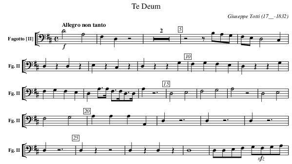 X:315 T:Te Deum C:Giuseppe Totti (17__-1832) M:C L:1/4 K:D V: 15 clef=bass name="Fagotto [II]" sname="Fg. II" %%MIDI program 1 68 %%staves [( 15 )] %----- edit between the lines ---- [Q:"Allegro non tanto"] !f! -D2 A,2 | F, D, z2 | Z2 | z2 z/ B,/A,/G,/ | \ F,/E,/D,2C,|D,z, D,z,|E,z, C,z,|D,z1 z1 G,|F,G,F,E,|D,z1 z1 G,|F,G,F,E,|\ D,A,/>A,/ F,/>F,/D,/>D,/|A,z3|D,2 E,2|F,2 G,2|A,2 z2|D,2 E,2|F,2 G,2|\ A,A,A,A,,|D,z3|D,z3|D,z3|D,z3 | D, zz2 | D,z,D,z | D,4 | D,/D,/E,/F,/ G,/!sfz!F,/G,/A,/ | \ %----------------------------------