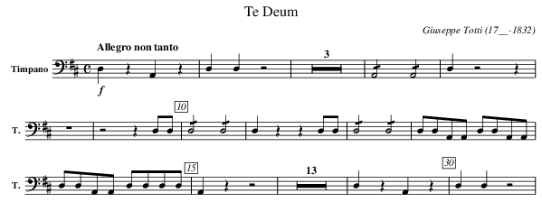 X:320 T:Te Deum C:Giuseppe Totti (17__-1832) M:C L:1/4 K:D V: 20 clef=bass name="Timpano" sname="T." %%MIDI program 1 1 %%staves 20 %----- edit between the lines ---- [Q:"Allegro non tanto"] !f! D,zA,,z | D,D,z2 | Z3 | \ !/!A,,2 !/!A,,2 | D, z2 z | Z | \ z2 z D,/D,/ | !/!D,2 !/!D,2 | D, z z D,/D,/ | !/!D,2!/!D,2 | \ D,/D,/A,,/A,,/ D,/D,/A,,/A,,/ | D,/D,/A,,/A,,/ D,/D,/D,/D,/ | A,, zz2 | Z13 | \ D,z A,,z | D, D, z2 |\ %---------------------------------
