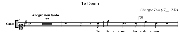 X:331 T:Te Deum C:Giuseppe Totti (17__-1832) M:C L:1/4 K:D V: 31 clef=alto1 name="Canto" sname="C." %%MIDI program 1 1 %%staves [[ 31 ]] %----- edit between the lines ---- [Q:"Allegro non tanto"] Z27 | z2 z z/A/ | d2 A>A | cA z2 |\ w: Te De-um lau-da-mus %---------------------------------